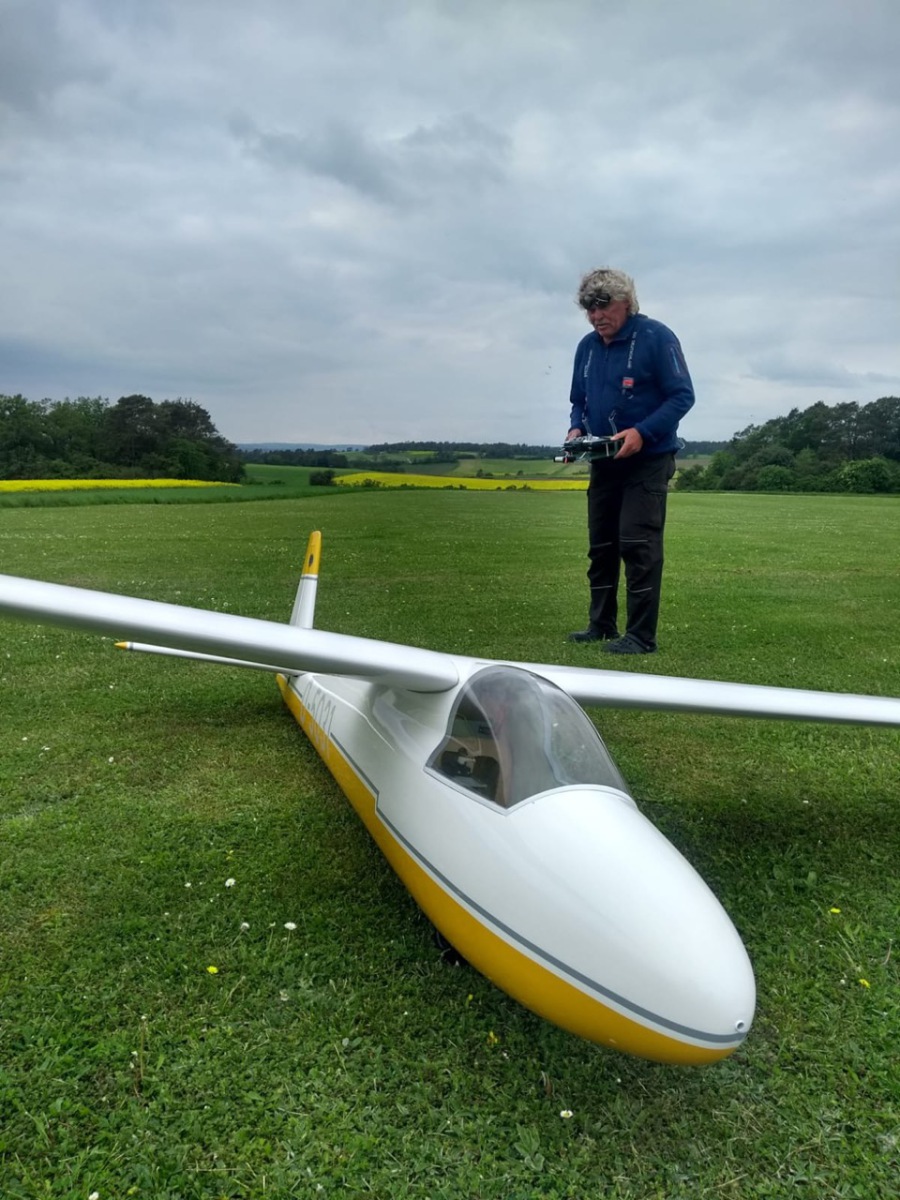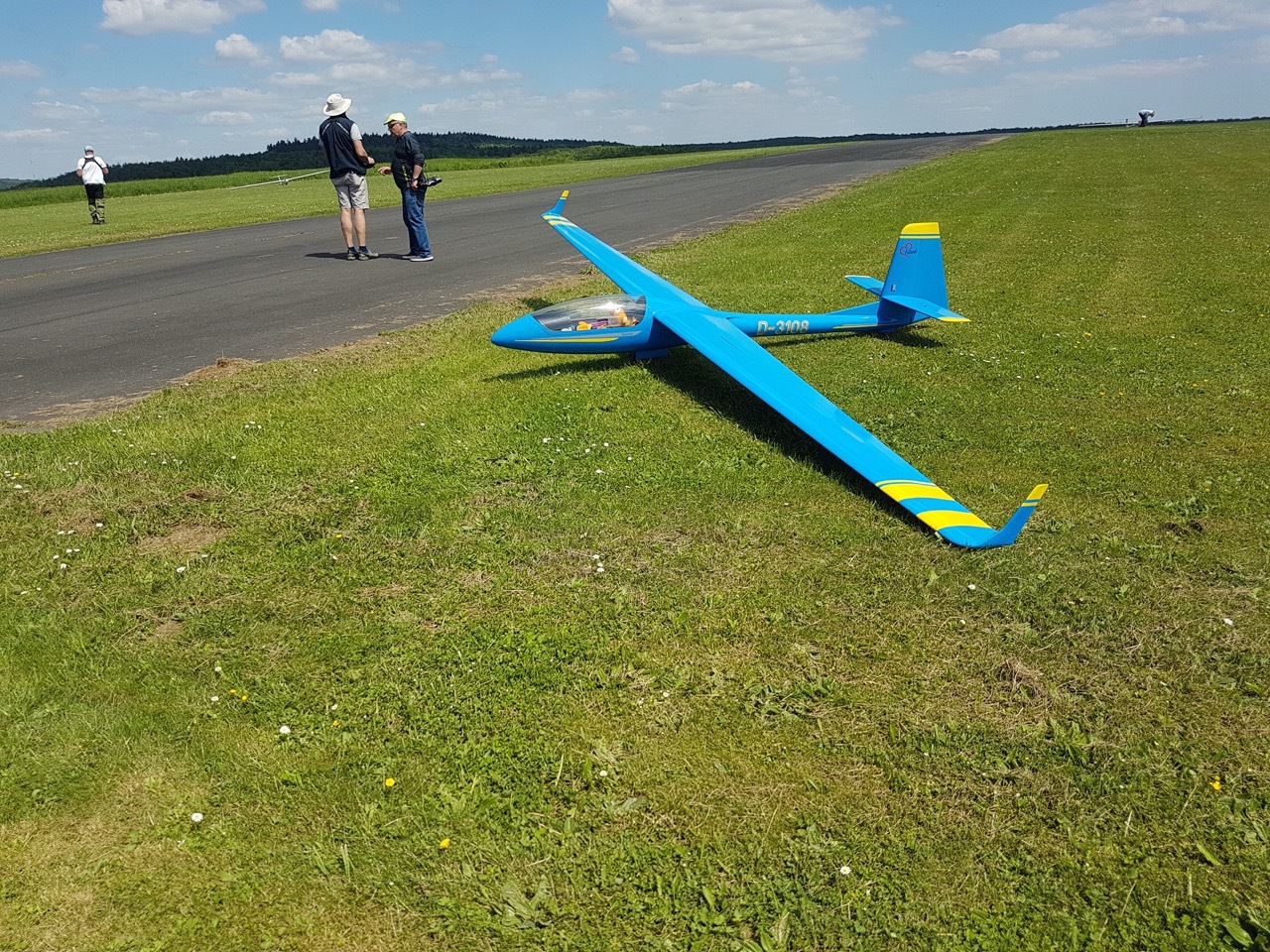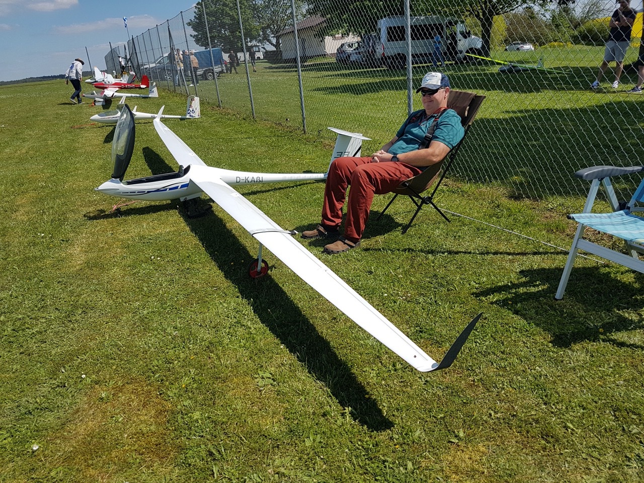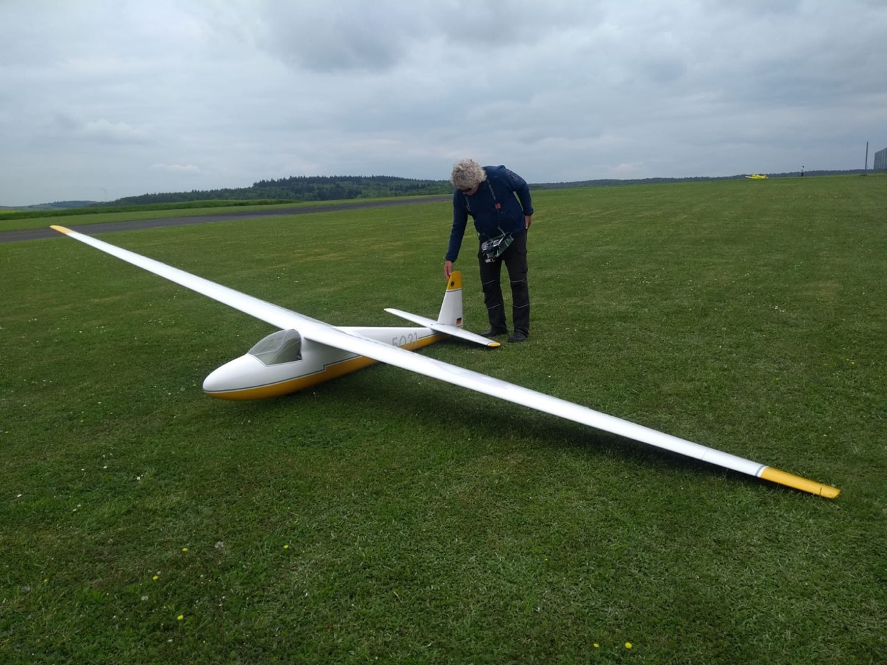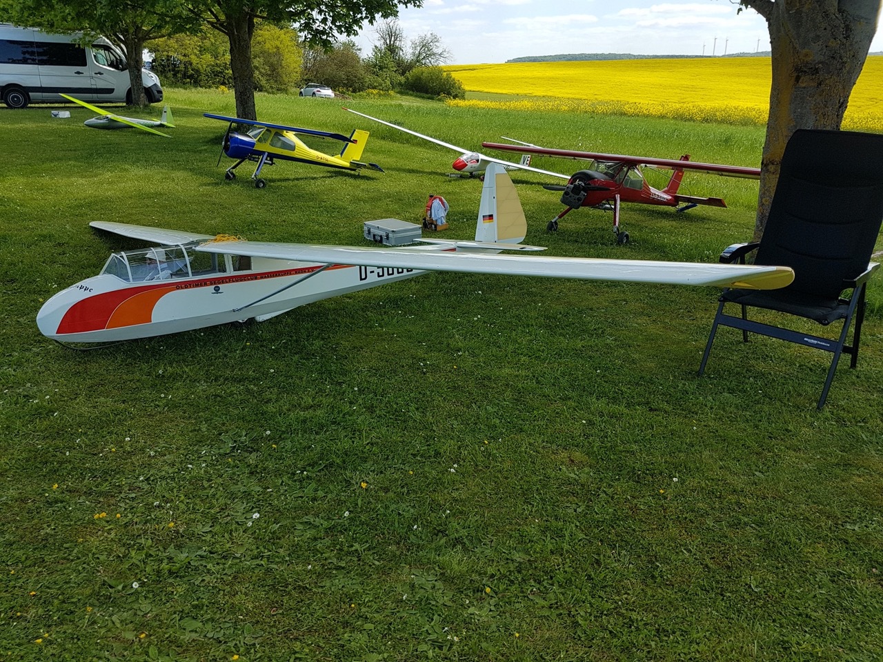 Alles in allem eine super Veranstaltung. Sonntags gab es noch mal was zum Schmunzeln. Unser Volker landete seine 1:2,5 ASK 23 sehr ordentlich, rollte vor seinen Füßen aus und dann plötzlich dieses unangenehme Wort „Sch……..“ !! Es fehlte die Kabinenhaube und der Sitz samt Pilot. Und keiner hatte gesehen wo der ausgestiegen war. Aber Hannelore persönlich war ja anwesend und es wurde direkt neu geordert……
