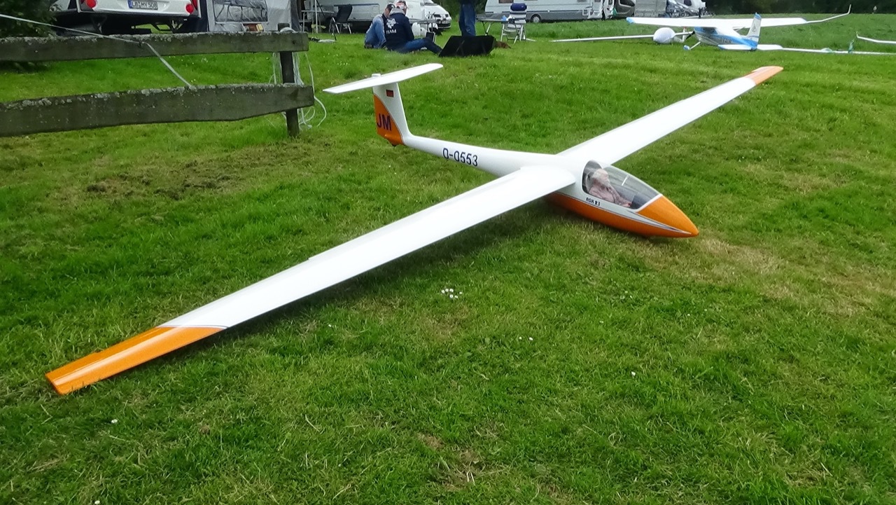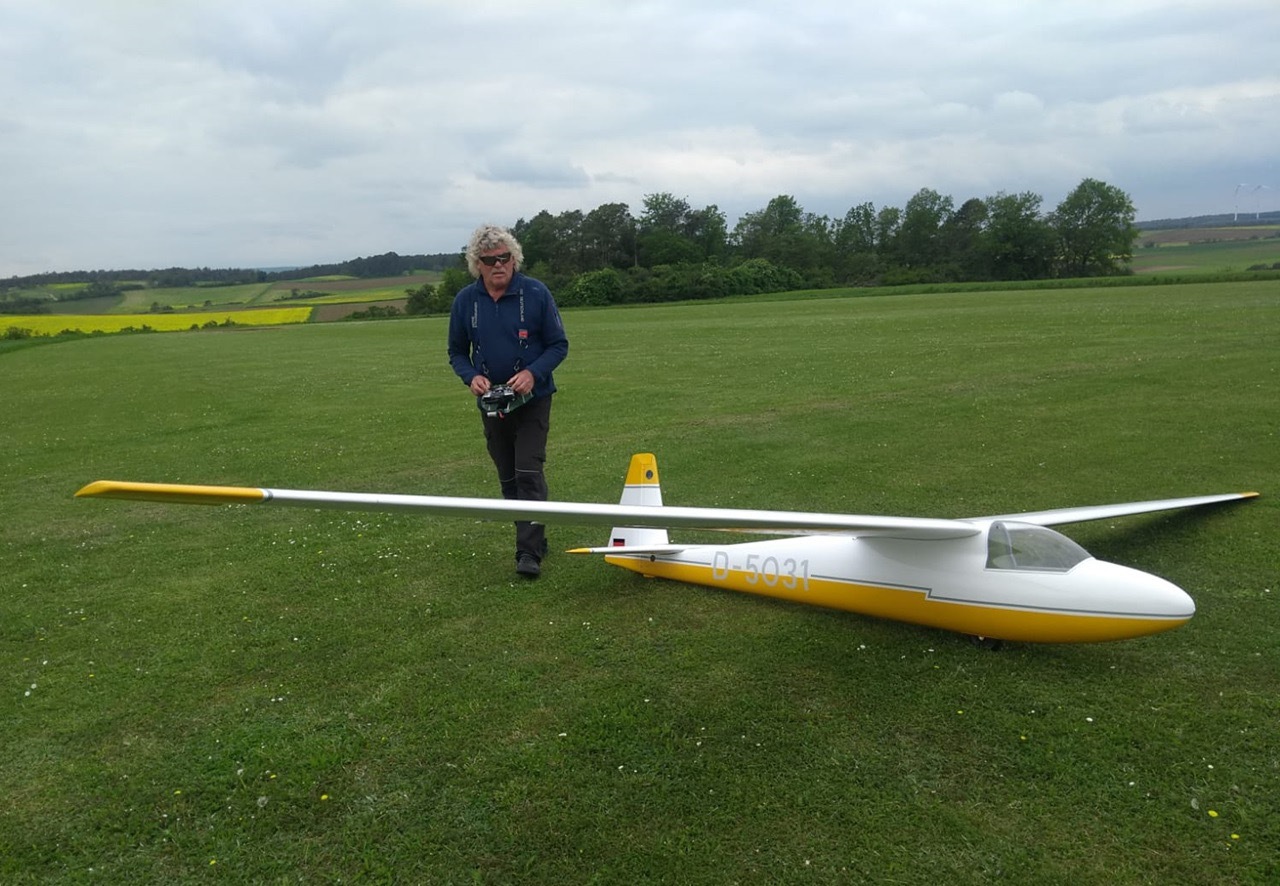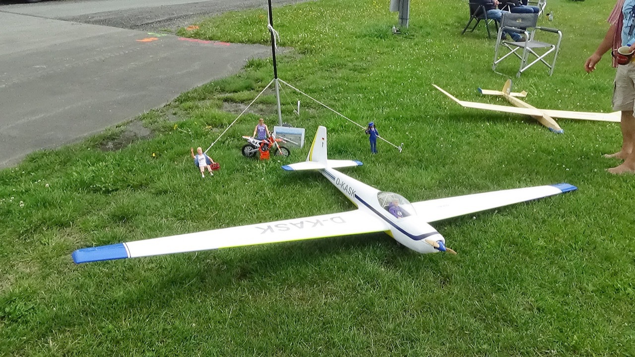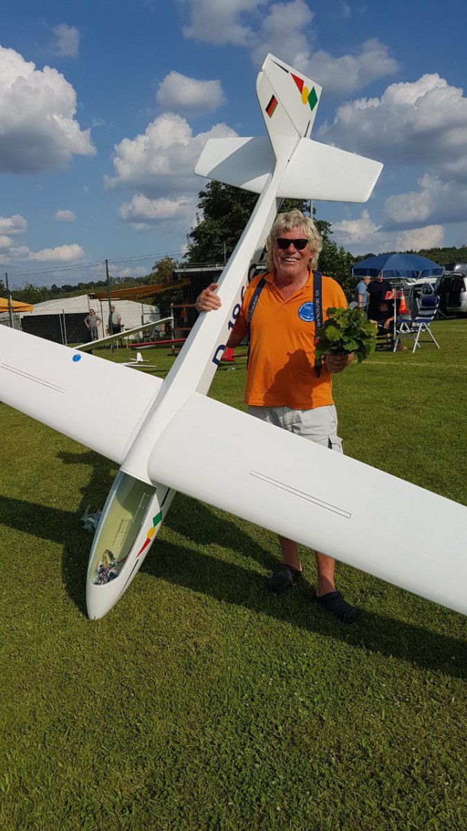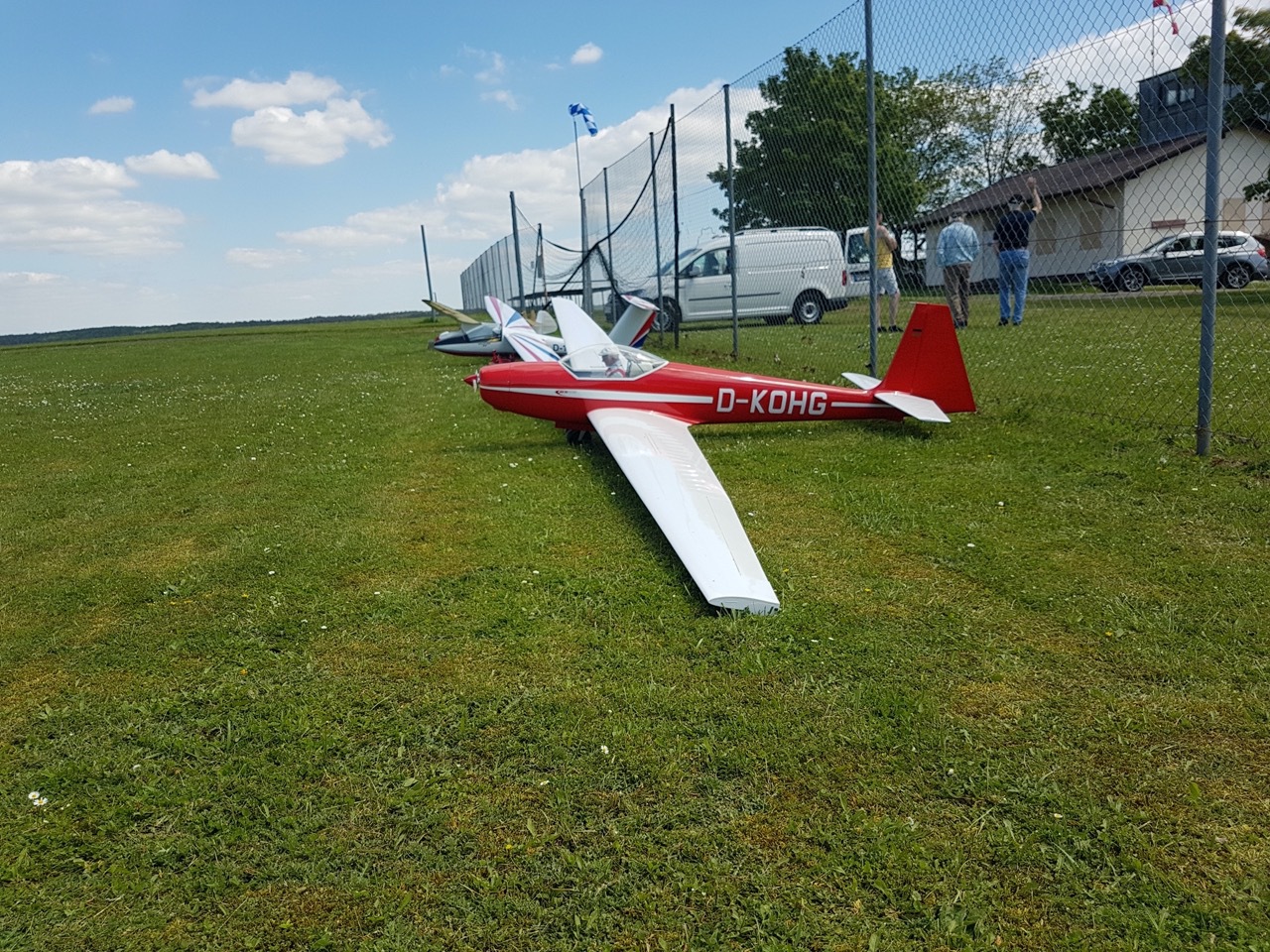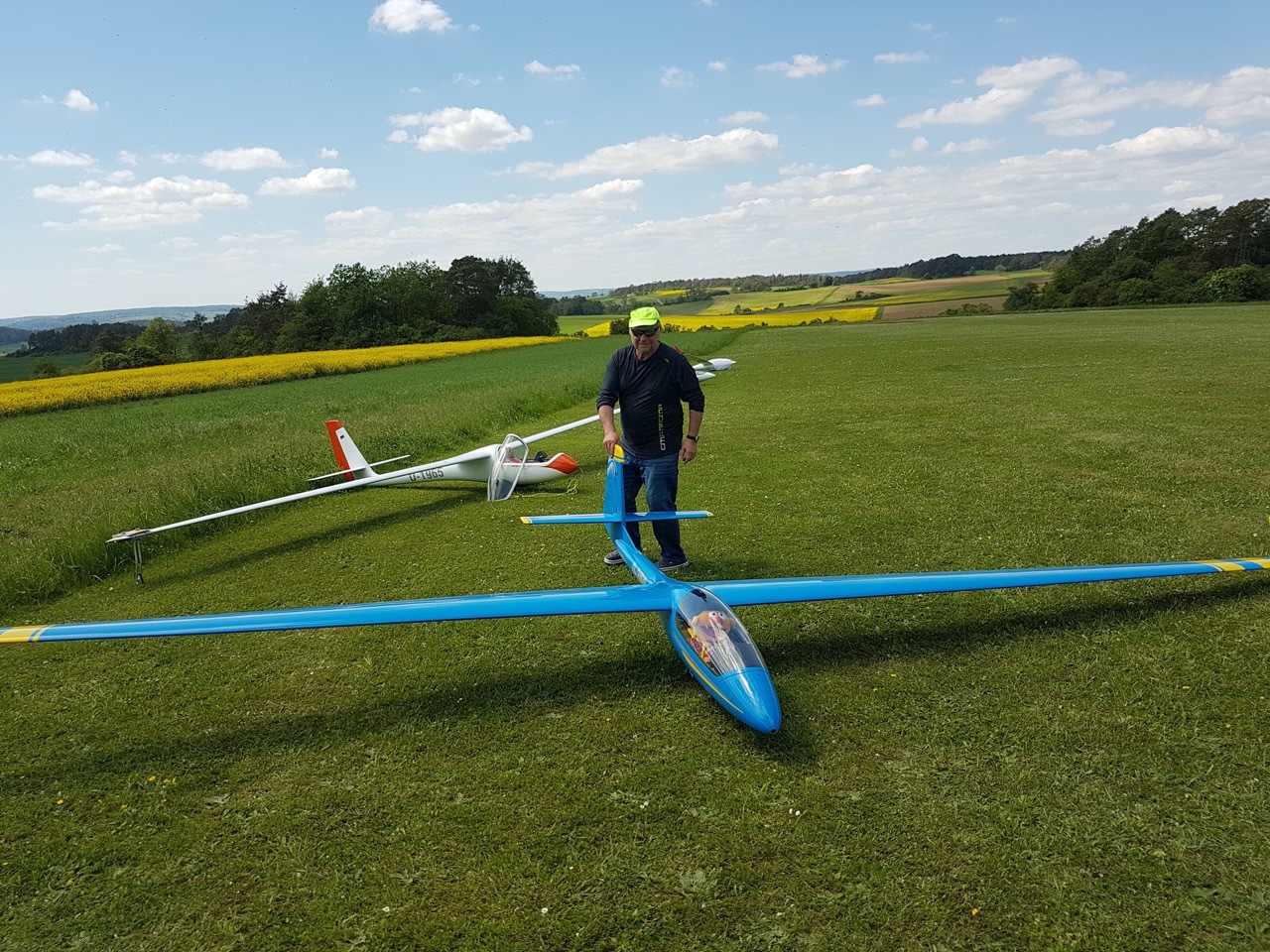 Alles in allem eine super Veranstaltung. Sonntags gab es noch mal was zum Schmunzeln. Unser Volker landete seine 1:2,5 ASK 23 sehr ordentlich, rollte vor seinen Füßen aus und dann plötzlich dieses unangenehme Wort „Sch……..“ !! Es fehlte die Kabinenhaube und der Sitz samt Pilot. Und keiner hatte gesehen wo der ausgestiegen war. Aber Hannelore persönlich war ja anwesend und es wurde direkt neu geordert……