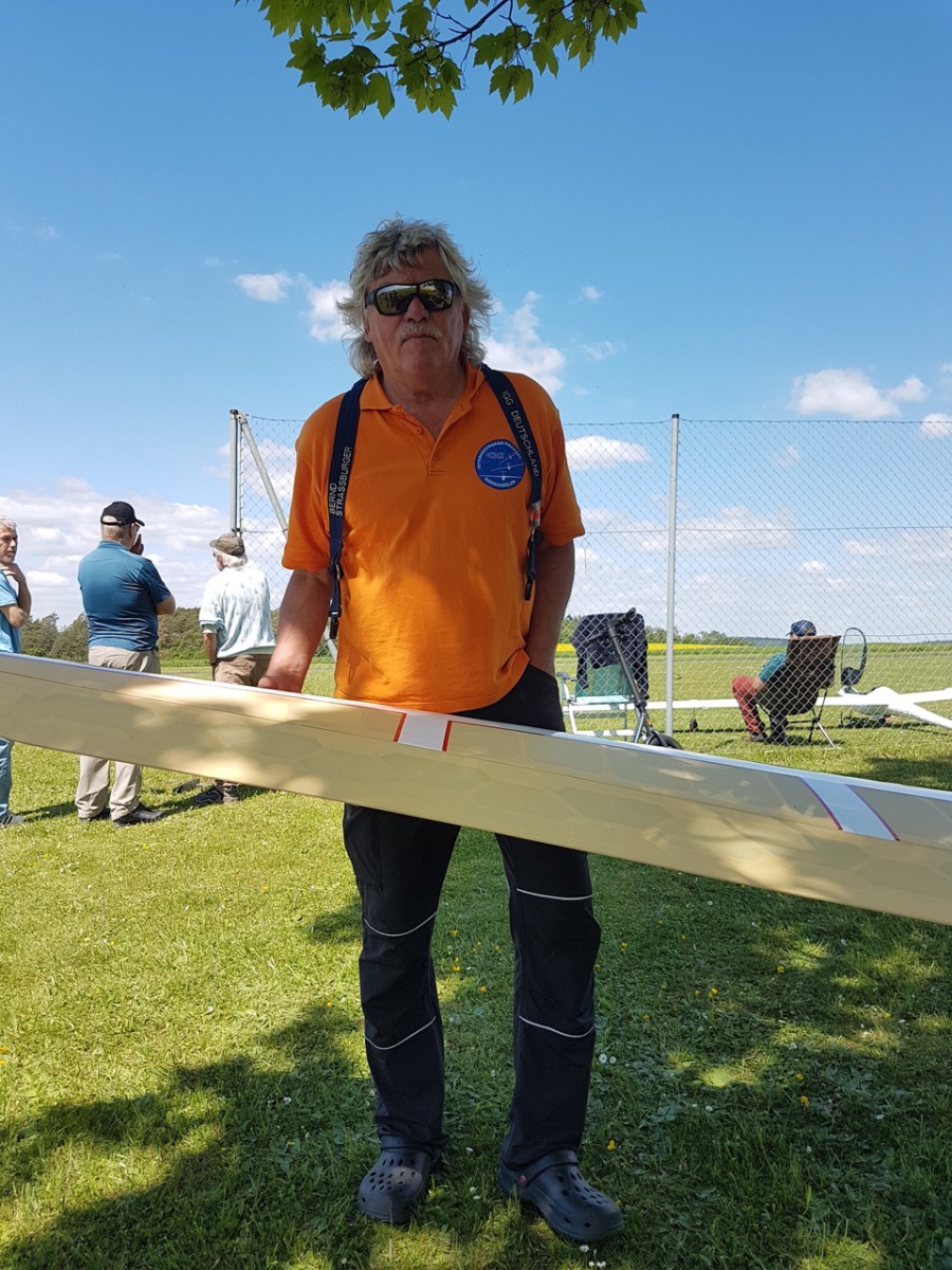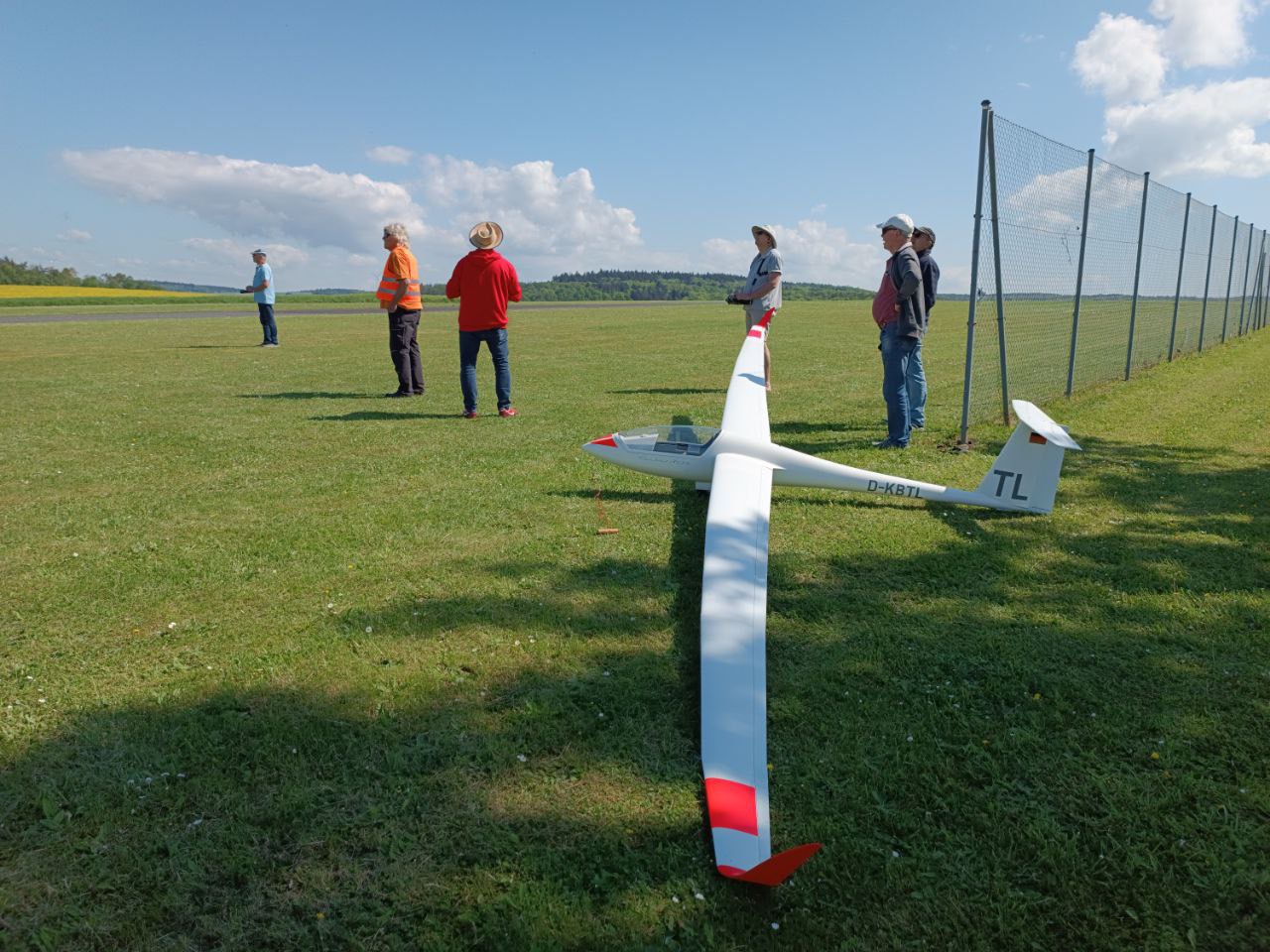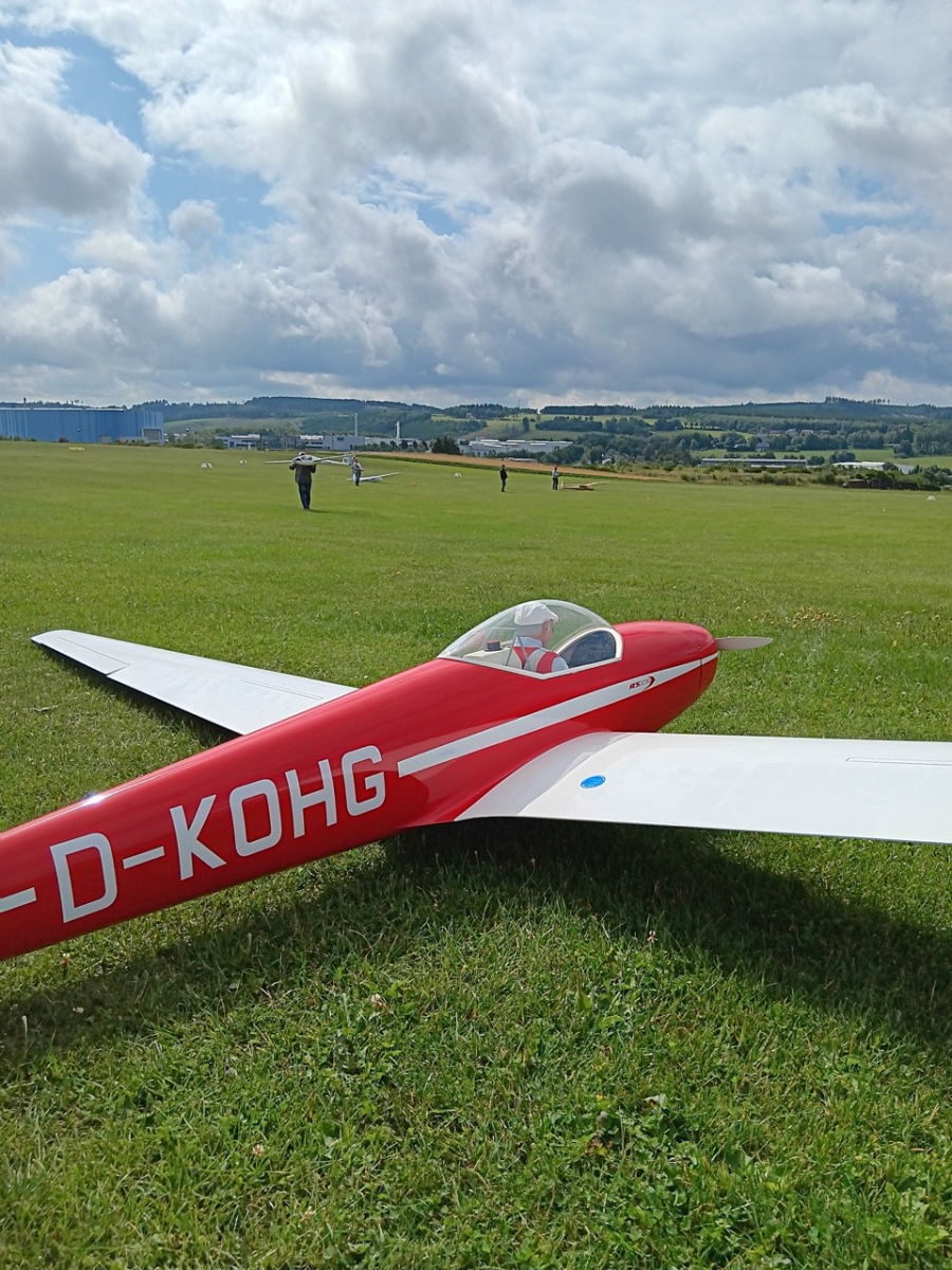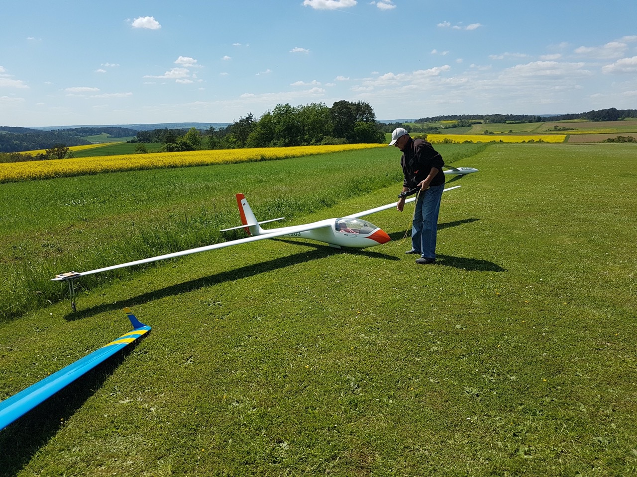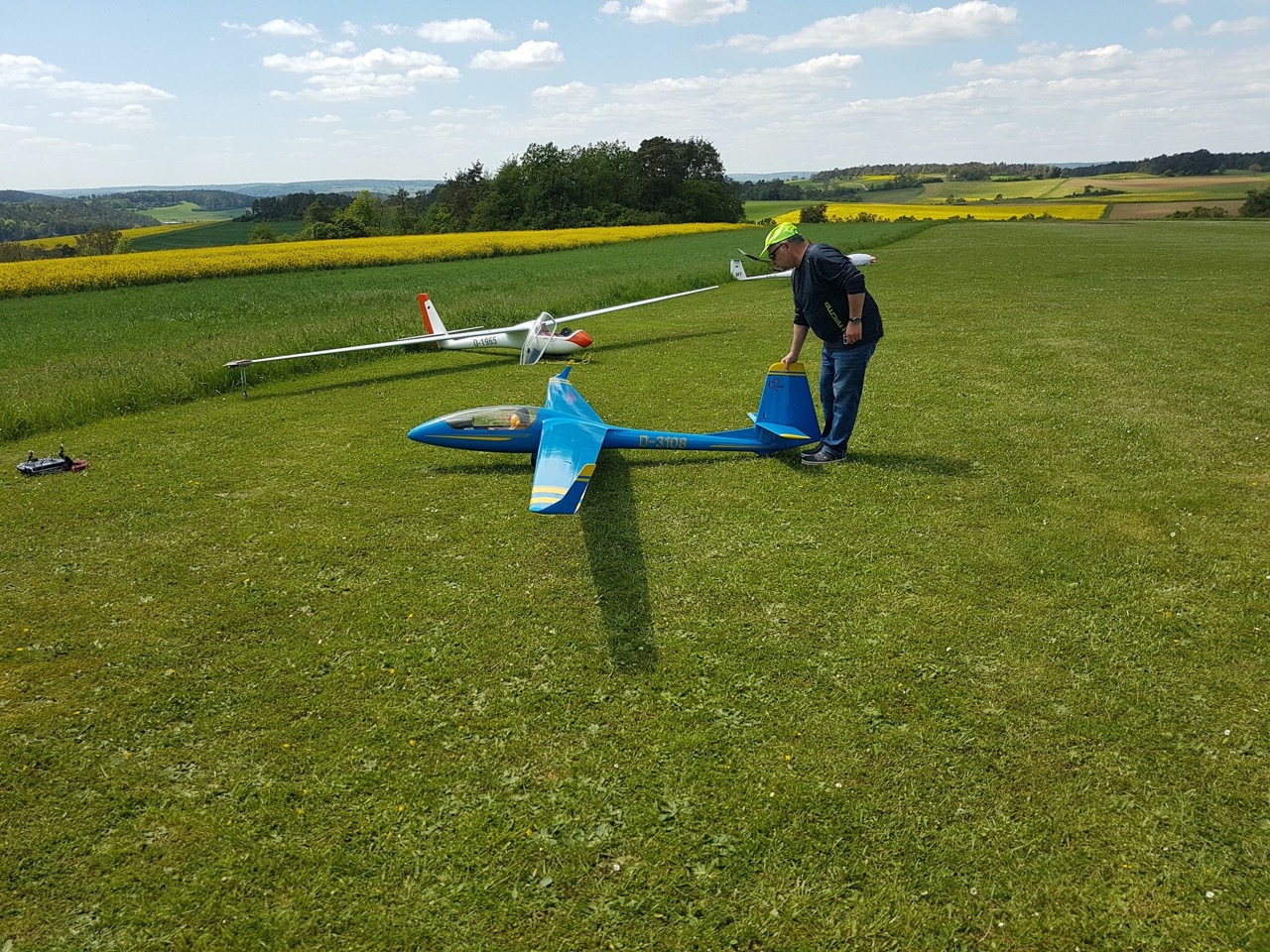 Alles in allem eine super Veranstaltung. Sonntags gab es noch mal was zum Schmunzeln. Unser Volker landete seine 1:2,5 ASK 23 sehr ordentlich, rollte vor seinen Füßen aus und dann plötzlich dieses unangenehme Wort „Sch……..“ !! Es fehlte die Kabinenhaube und der Sitz samt Pilot. Und keiner hatte gesehen wo der ausgestiegen war. Aber Hannelore persönlich war ja anwesend und es wurde direkt neu geordert……