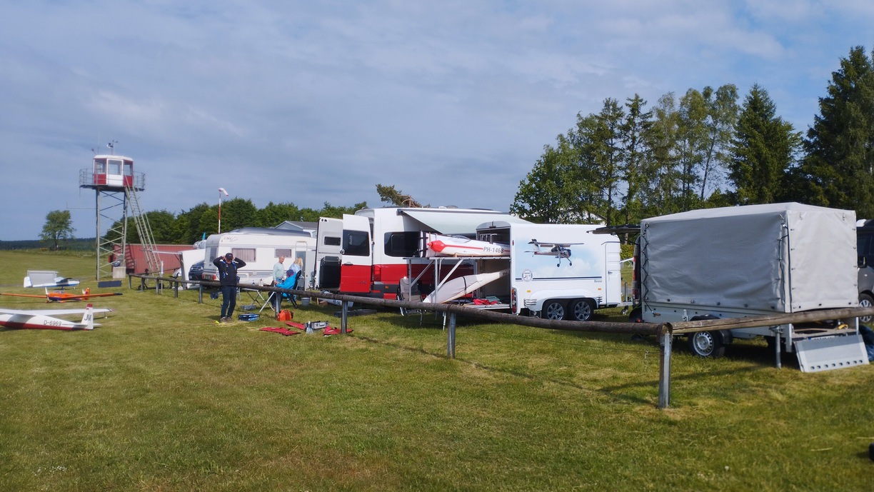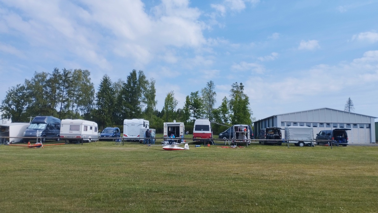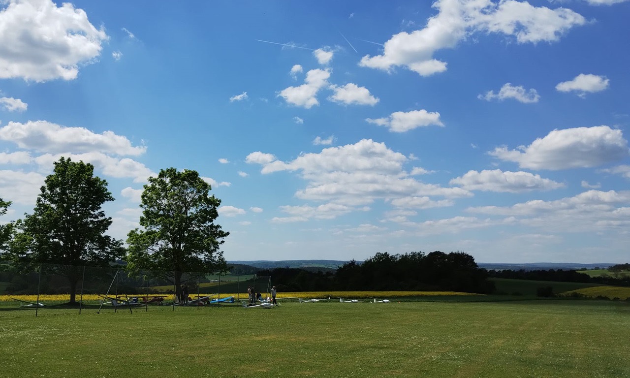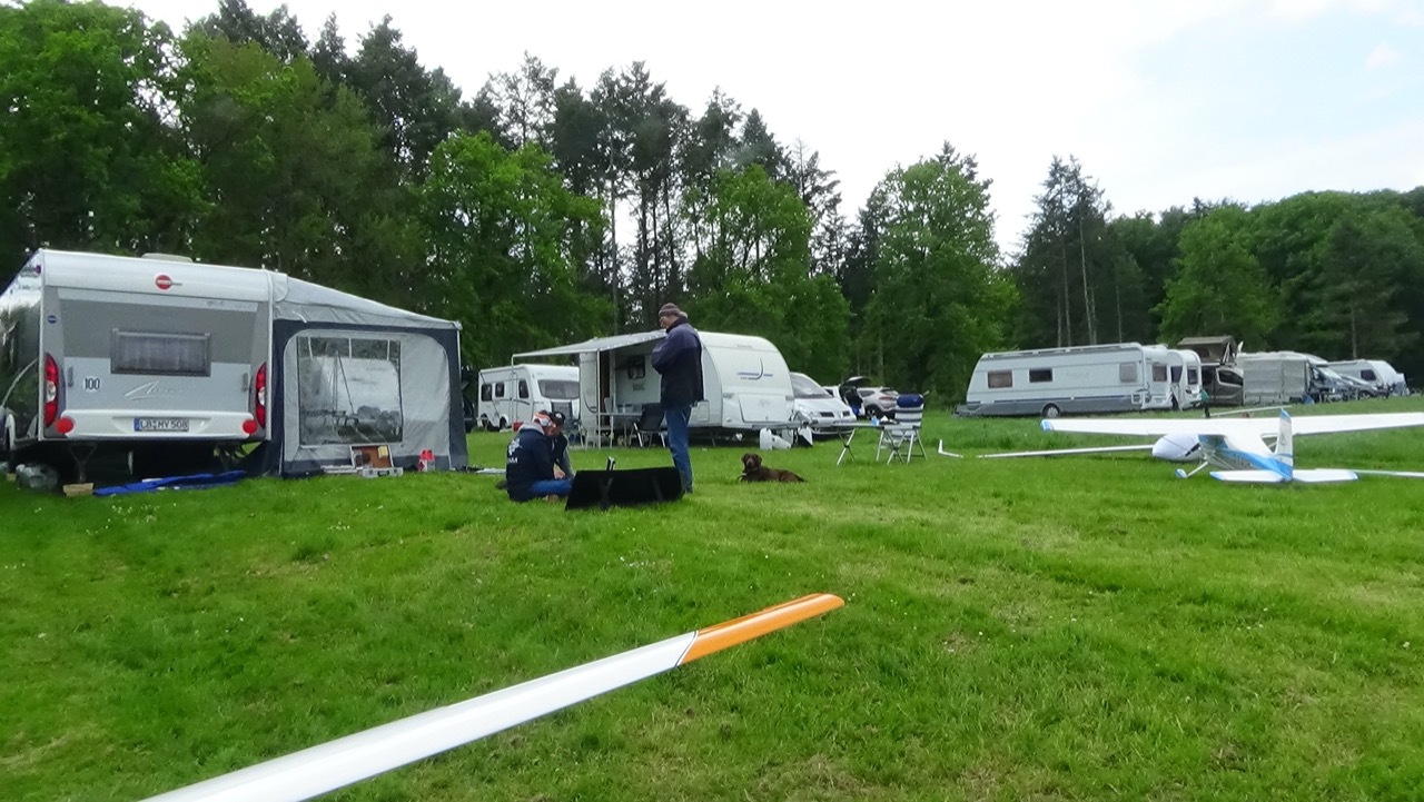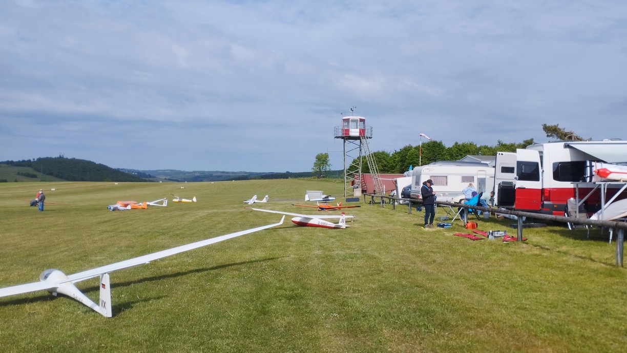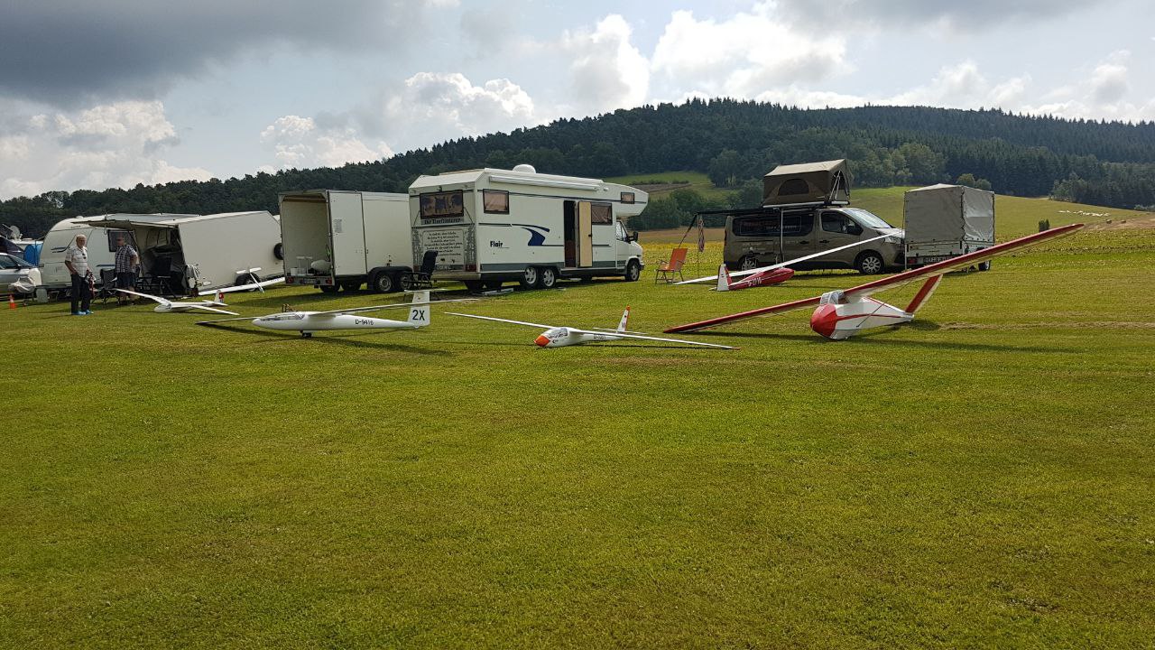 Die Männer um Vorstand Marco Itzel hatten das Gelände hervorragen vorbereitet. Die ersten Piloten reisten schon Montags an. Am Anfang war es noch Abends und Nachts empfindlich kalt und wir ließen den Tag draußen vor den Wohnwagen in Wolldecken eingehüllt ausklingen. Tagsüber aber herrschte super Thermik. Bei einer Platz-Ausrichtung Ost-West und einer Windrichtung Nord-Ost gab es keine jeglichen Probleme bei Starts und Landungen. Die Thermik war teilweise so stark dass unsere OLC-Piloten Dreiecke ohne einen einzigen Thermik-Kreis flogen. Eigentlich kein leichtes Unterfangen weil man beim Beenden des Dreiecks im Start/Zielkreis höher ankommen muss als man das Dreieck begonnen hat.
