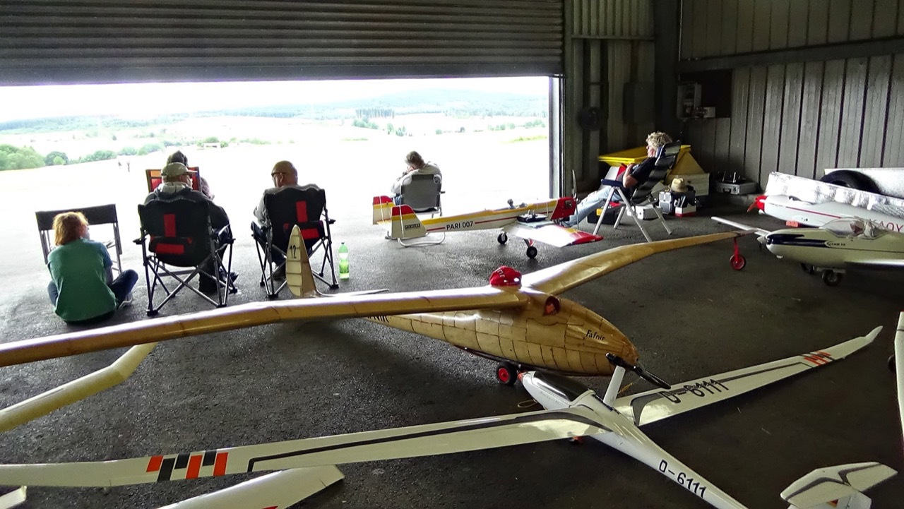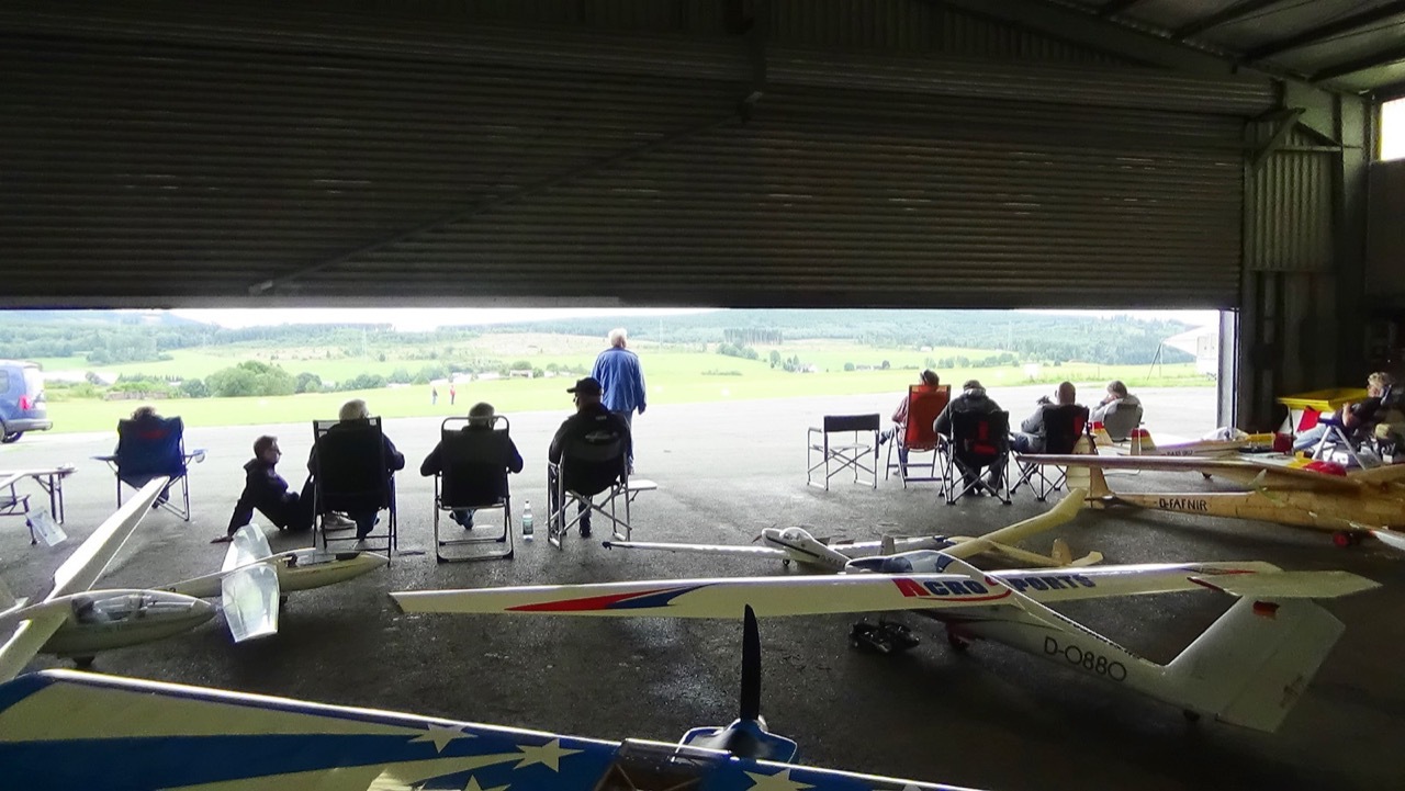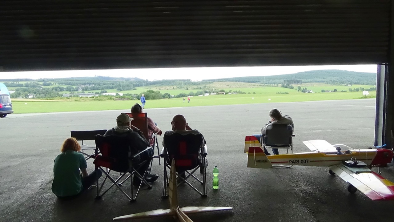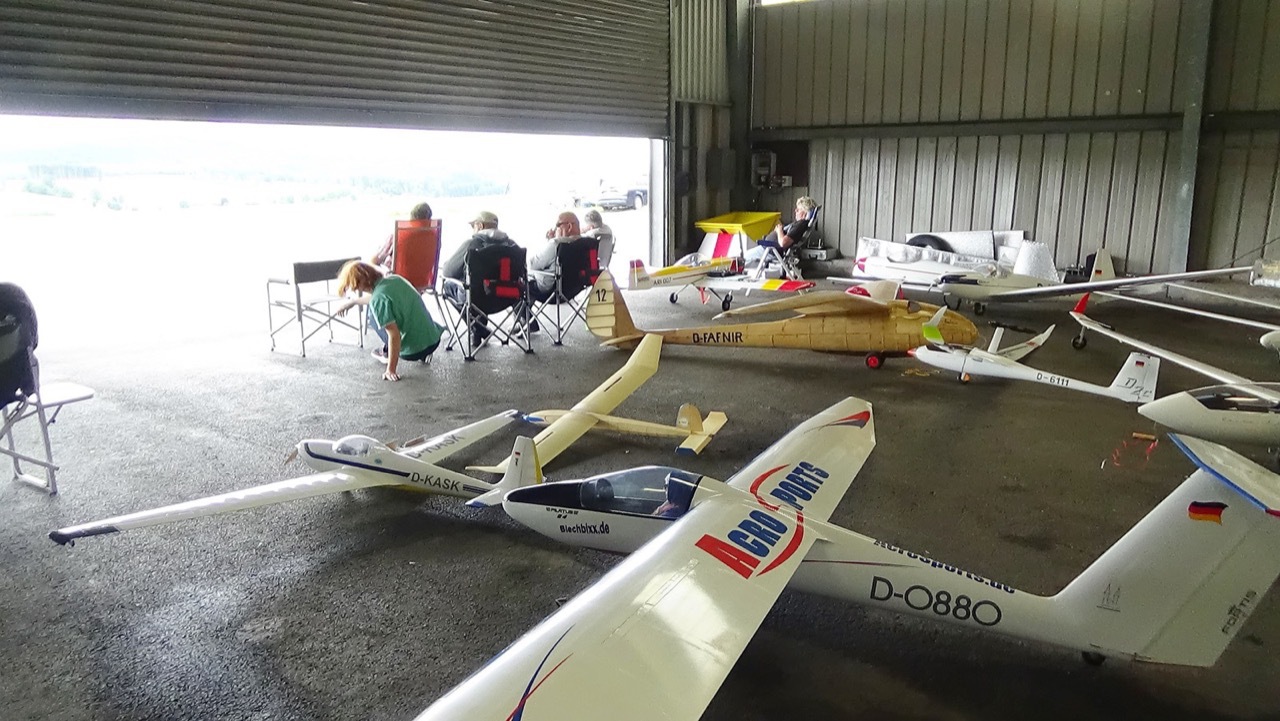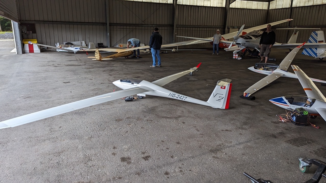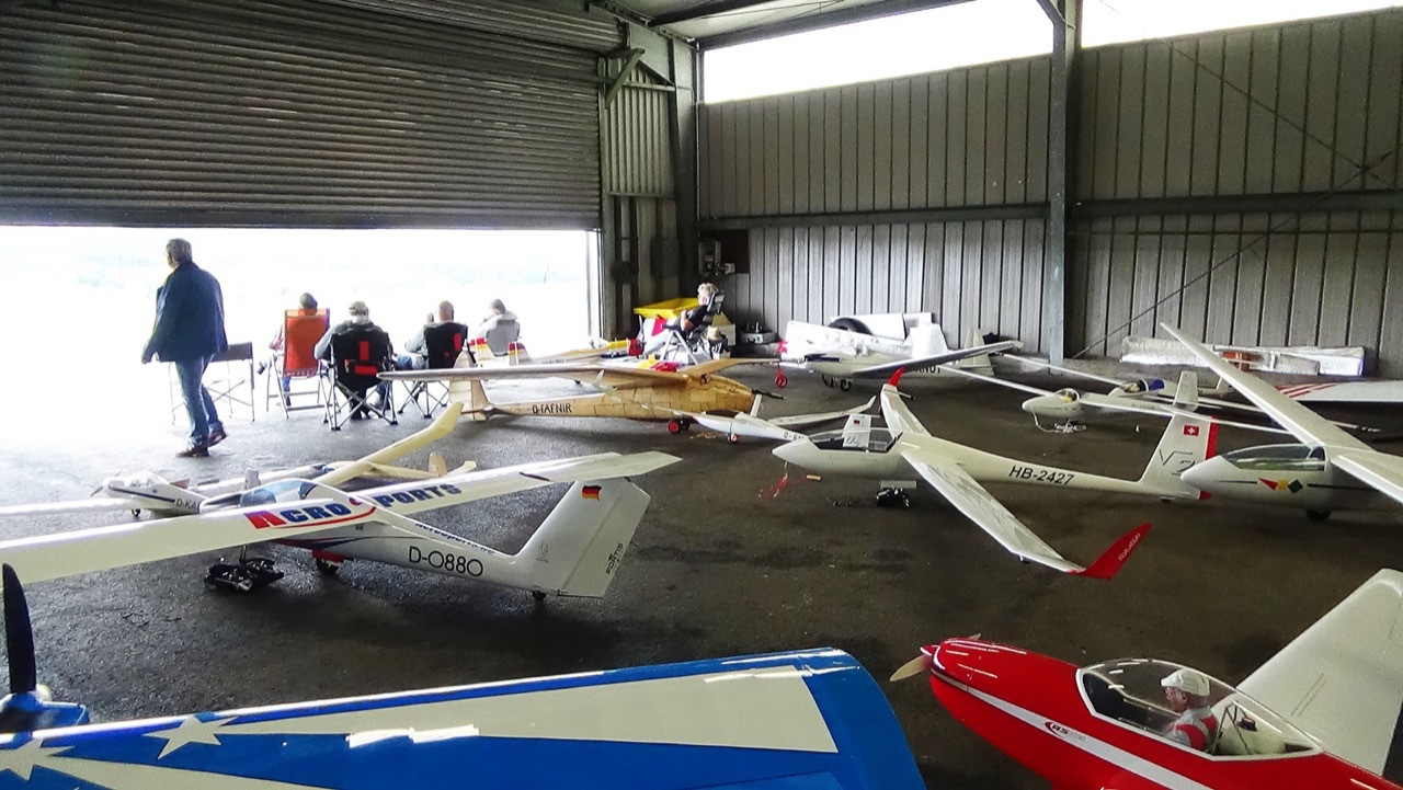 Am Samstag wurde ab 10:00 Uhr den ganzen Tag geflogen. Während zwei oder drei kleinen Regenschauern konnten unsere Modelle in einem riesigen Hangar direkt an der Startstelle untergestellt werden. Dieser Hangar wurde extra für uns IGGler ausgeräumt.