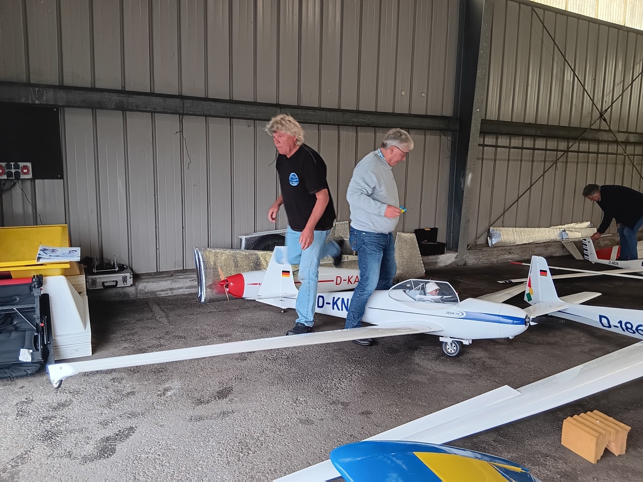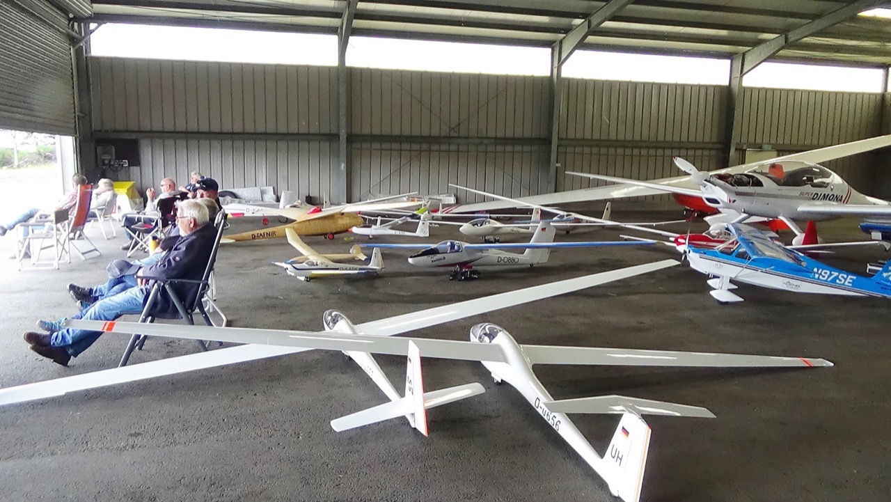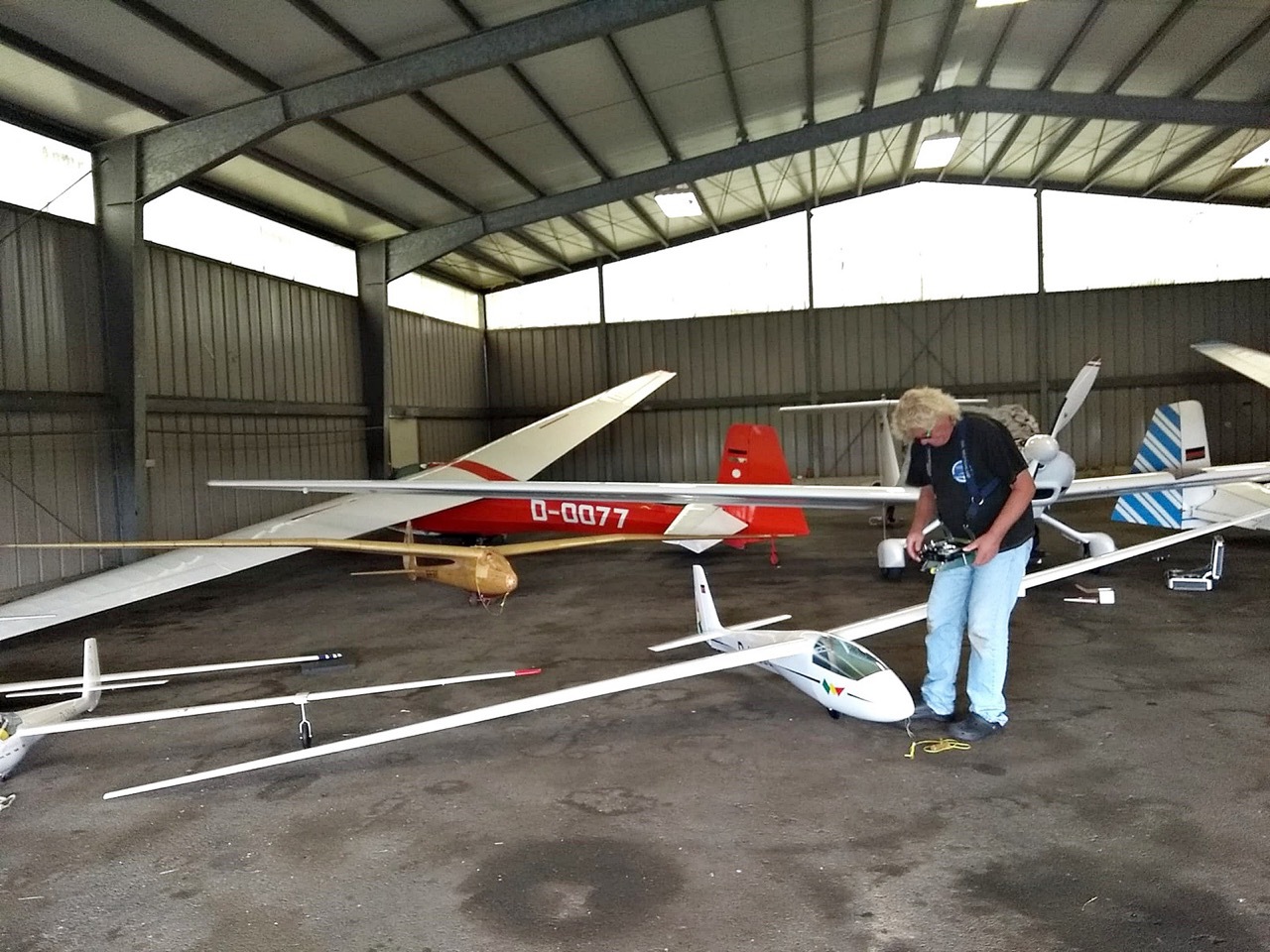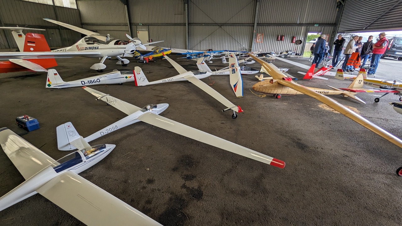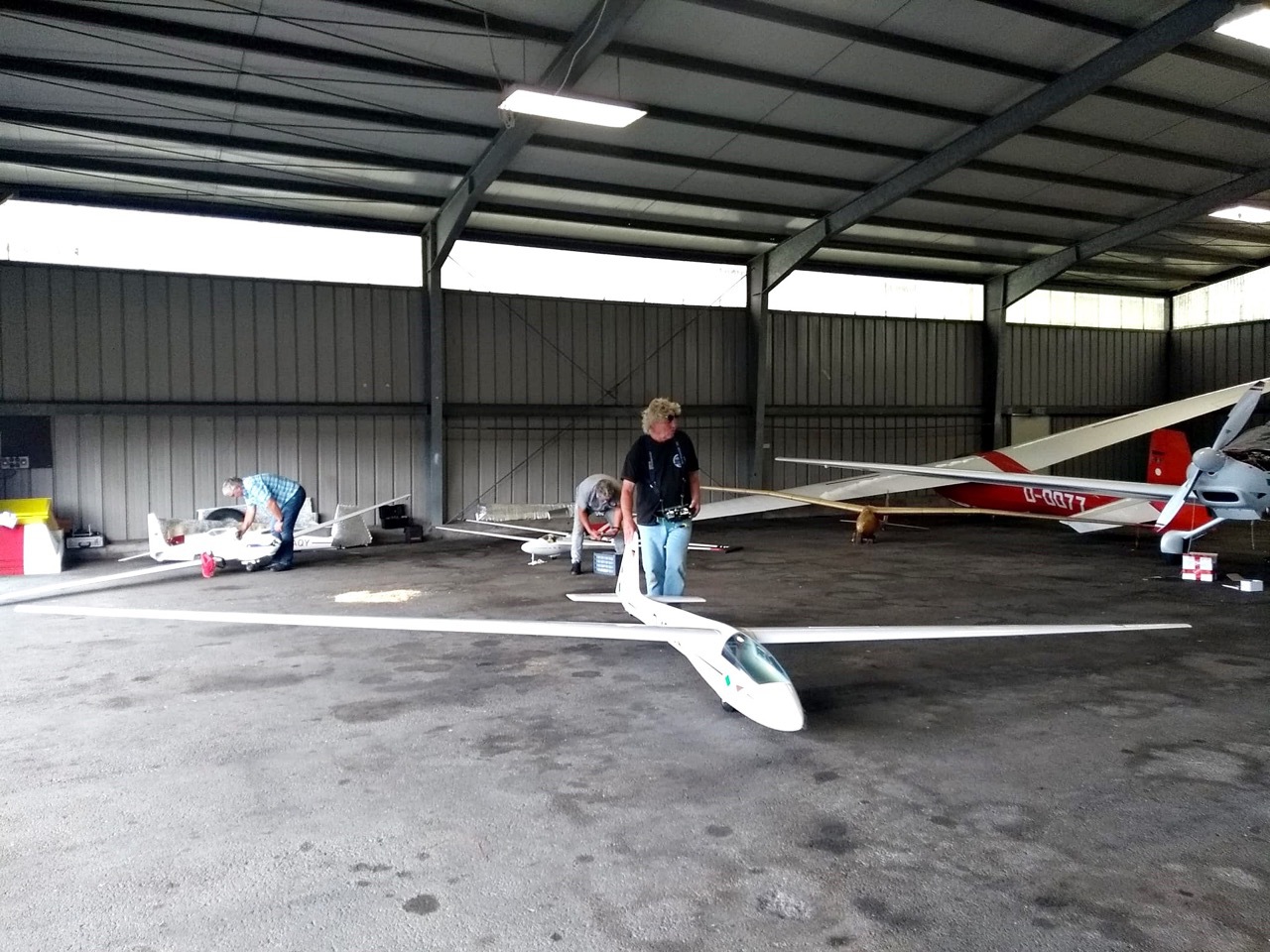 Am Samstag wurde ab 10:00 Uhr den ganzen Tag geflogen. Während zwei oder drei kleinen Regenschauern konnten unsere Modelle in einem riesigen Hangar direkt an der Startstelle untergestellt werden. Dieser Hangar wurde extra für uns IGGler ausgeräumt.